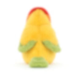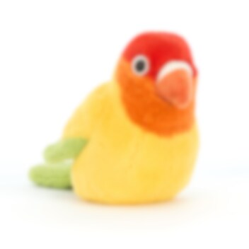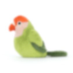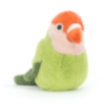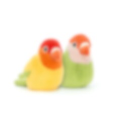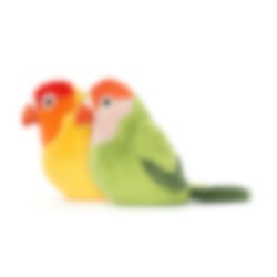 Et bedårende par dvergpapegøyer - fargerike afrikanske dvergpapegøyer som danner par som varer hele livet. Disse små skjønnhetene er flerfarget i lysegrønt, solgult, beige, oransje, skogsgrønt og rødt, og har pene hvite markeringer rundt øynene og over den buede nebben. Paret holdes sammen av noen sting som kan fjernes for å skille fuglene. Håndvaskes ved behov.