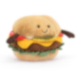 En deilig liten burger med et solfylt smil og skikkelig fylt med deilig innhold. Det gyldenbrune hamburgerbrødet i to nyanser med små morsomme armer i mørkebrun manchester er fylt med en luftig syltet agurk, noen skiver tomat, solgul ost og en volang av grønn salat i mocka-imitasjon, og selvfølgelig stjernen, en tykk, luftig hamburger. En støttende og oppmuntrende venn eller trøstemat som garantert får både store og små til å smile. Håndvaskes ved behov.