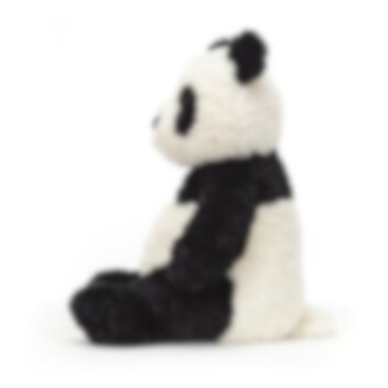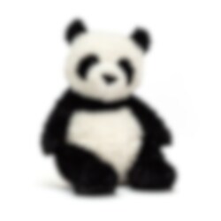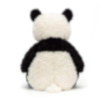 En skikkelig stor, kosete og luftig panda med en litt lubben kropp i svart og hvitt. Denne store drømmende bamsen er elegant mønstret, med et gjennomtenkt uttrykk i ansiktet, en liten stump for en hale og en søt trekant for en nese. Håndvask og flat eller heng tørk om nødvendig.