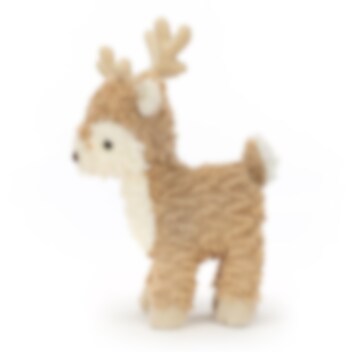 Et søtt reinsdyr i lysebrunt og hvitt, med fløyelsmyke horn og hover og en søt liten sjokoladebrun nese. Dette litt rufsete, lille reinsdyret har en søt liten hale, imponerende horn og er både kjekk og kosete. Bena er myke, men sterke nok til at reinen kan reise seg og være en del av pynten i vinter eller i jula. Laget av 78% polyester, 17% bomull, 4% rayon, 1% spandex og håndvask ved behov.