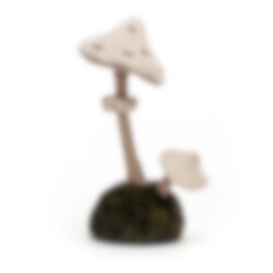 Koselige og elegante eksemplarer av stor parasollsopper som gir en følelse av høst. Disse attraktive lyse soppene i hvit og lys beige har karakteristiske mørke skjell på hetten og lange slanke stilker med en ring som ligner på en scrunchie. Vanligvis finner du dem i lysninger eller enger, men her er de krøllet sammen i en klump myk og luftig mose flekkete i to muggen grønne toner. En slitesterk og stilig dekorasjon eller like gjerne et uvanlig kosedyr. Håndvask om nødvendig.