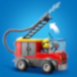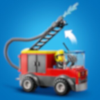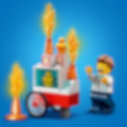 LEGO® Citys brannkonstabler har tatt seg en velfortjent lur på brannstasjonen, men plutselig går brannalarmen. Å, nei! Det har tatt fyr i en popkorn-kiosk! Sjekk skjermen for å finne ut hvor det brenner. Få på deg brannhjelmen og skli ned til brannbilen… JUBIII! Sett deg bak rattet, og kjør i full fart til brannstedet for å slokke brannen... og redde popkornet!