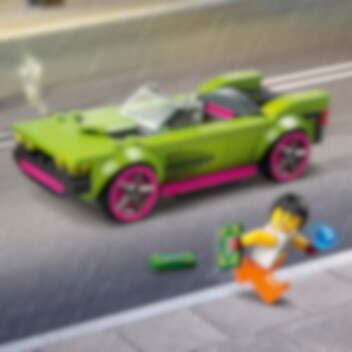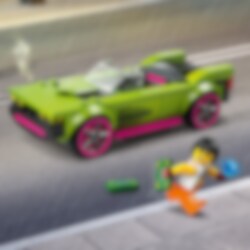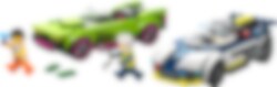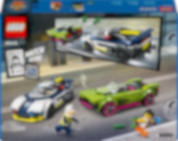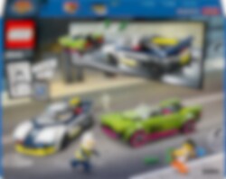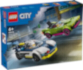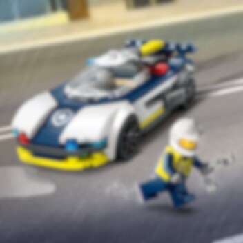 Fangen har rømt! Ta plass i førerhuset på politiets tøffe innsatskjøretøy, og ta opp jakten på en av LEGO® Citys største skurker. Politibilen er utstyrt med en stor bakspoiler, fete felger og tøffe lavprofildekk for ekstra fart og veigrep. Sladd på bakhjulene, og kjør så det hyler i svingene for å ta igjen skurken i den lynraske muskelbilen hennes! Det blir heftig action i LEGO City!