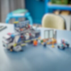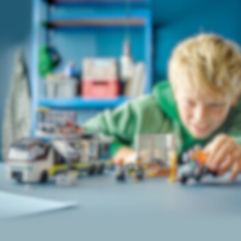 Politietterforskerne kan undersøke sporene etter skurkene med lekesettet LEGO® City Politiets mobile etterforskningslab (60418). Det tøffe lekesettet for barn fra sju år inkluderer en leketrailer med arbeidsstasjoner, et kart, skjermer for kameraovervåkning, et mikroskop, kaffemaskin og fengselscelle. Settet inkluderer også et åsted og skurkenes ATV. Med minifigurer av to betjenter, en forsker og to skurker er alt duket for episke eventyr! Dette LEGO City settet med politikjøretøy for barn inkluderer trinnvise, trykte byggeinstruksjoner samt 3D-instruksjoner i LEGO Builder appen. Appen er en digital byggeveiledning med intuitive verktøy for zooming og rotering som lar barn se modeller fra alle kanter mens de bygger dem. Din by, ingen grenser! LEGO City sett får barn kule kjøretøy, realistiske byggverk og gøyale figurer som inspirerer dem til fantasifull lek uten regler. Politilekesettet kan kombineres med andre (selges separat) i LEGO City serien for å gi barn en hel verden av lekemuligheter.