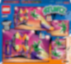 Du kan glede deg til spektakulær stuntshow-action med Stuntrampe med basketutfordring! Plasser ringen i horisontal posisjon, få i gang motorsykkelens svinghjul og kjør opp rampen i full fart for å utføre det perfekte «dunk». Slå ut LEGO® flammene mens du treffer kurven for å øke ferdighetsratingen din. Snu ringen til vertikal posisjon, og gjør deg klar for stjernespekket stuntaction!