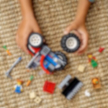 Kör ut på landsbygden i denna ikoniska LEGO® City traktor. Att köra över tuff terräng är inga problem med traktorns stora bakdäck. Lasta höbalarna och lådan med pumpa, äpple och morötter i traktorskopan. Höj sedan bommen för att lyfta upp dem i luften och kör dem till bonden och hans dotter - det finns en hungrig kanin att mata!