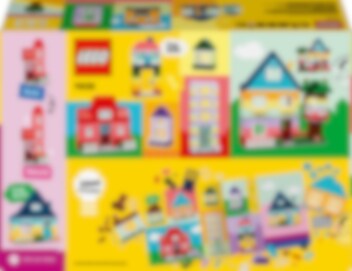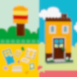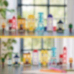 Bygg seks fargerike hus i ulike designer, høyder og former. Du kan fortsette den kreative moroa ved å tilføye flere klosser og gjøre husene høyere, og bytte ut dører, vinduer, tak, hager og mer for å lage ditt eget design. Sjekk ut de åtte medfølgende ideene for flere muligheter til å gjøre husene enda kulere – eller kombiner masser av klosser for å bygge et kjempestort hus!