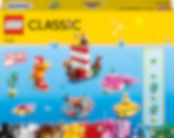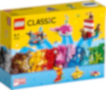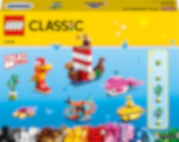 Ta læring gjennom lek til nye høyder med settet LEGO® Classic Kreativ lek til havs, som inkluderer et fargerikt utvalg av LEGO deler og bildeinstruksjoner for bygging av seks inspirerende minimodeller. Barn, venner og familie kan bli med og bygge et vikingskip, en gul ubåt, en undervannsdrone, en sjøhest, en hval og en skilpadde. Etterpå kan de bruke de to ekstraposene med klosser og lage sine egne LEGO modeller.