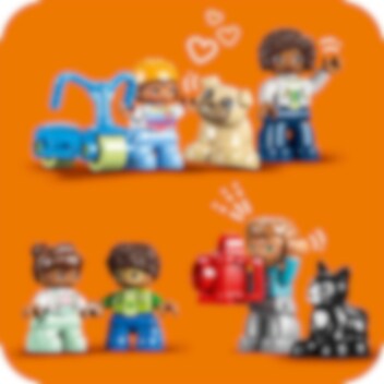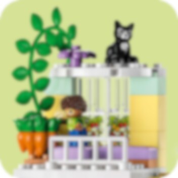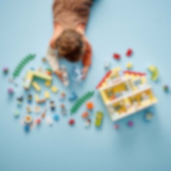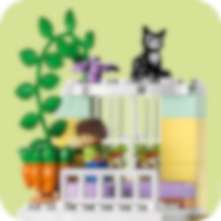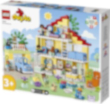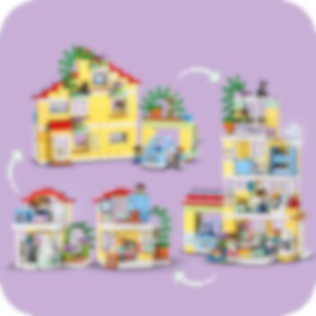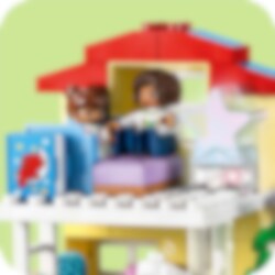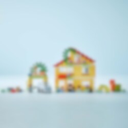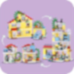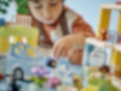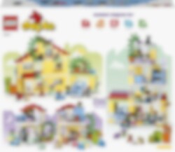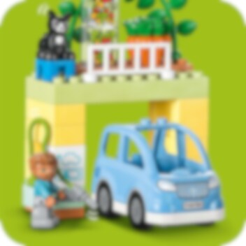 Velkommen til LEGO® DUPLO® Town 3-i-1 Familiehjem (10994), hvor barn kan utforske en hel verden av læring. Huset er fullt av autentiske detaljer og gir foreldre og barn fra to år muligheten til å iscenesette koselige øyeblikk i familien. Med sju figurer kan barn uttrykke seg fritt og foreldre lære barn om sosiale koder. Passer for barn som liker å leke mor, far og barn Dette lekehuset gir små barn utallige læringsmuligheter. Gjennom lek kan de lære om leggerutiner, inkludert tannpuss og høytlesning i køyesengen, og skape en koselig stemning med lysklossen i stjernelampen. De lærer også om sunn mat på kjøkkenet eller ved å plukke tomater og gulrøtter i hagen. I garasjen står det en byggbar elbil som «lades» av solcellepaneler, og er utstyrt med en gøyal «skyv og slipp»-funksjon for actionfylt lek. Ekte kreativ bygging Leken holdes i gang med dette huset som kan bygges på tre forskjellige måter. Små barn kan bygge et stort treetasjes hus, en høy lekebygning eller to mindre boliger med en hage mellom.