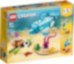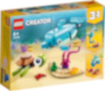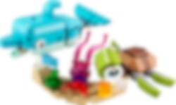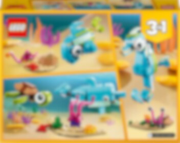 Med 3-i-1-byggesettet Delfin og skilpadde (31128) kan LEGO® fans fra seks år og oppover dykke ned til havbunnen, hvor spennende eventyr venter på dem. Settet inkluderer en delfinunge med bevegelig kropp, luffer, kjeve og hale og en skilpaddeunge med bevegelige luffer og hode. Begge står på en utstillingssokkel. Modeller av ville dyr gir fantasifull lek Med dette 3-i-1-settet fra LEGO Creator fortsetter den gøyale undervannsleken i det uendelige med tre byggbare dyreleker. Barn kan bygge en bevegelig delfin og skilpadde, bygge dem om til en bevegelig sjøhest med en sjøsnegle før de forvandler dem til en vakker fisk som svømmer med en krabbe. Og til slutt kan de finne på et helt nytt og annerledes dyr! LEGO byggesett gir kreativ lek Med LEGO Creator 3-i-1 får barn alt de trenger for timevis med gøyal lek med tre forskjellige byggbare modeller i hvert sett! Leken kan vare i det uendelige, siden hver detaljerte og realistiske modell kan tas fra hverandre og bygges om til hva som helst som barna finner på! Barna kan velge mellom mange fantastiske 3-i-1-sett med blant annet tigere, biler og jetfly.