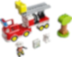 En katt sitter fast øverst i et høyt tre! Kjør brannbilen dit så fort du kan med blinkende lys og påslått sirene. Den vesle helten din kan trykke og vri på spaken for å heve stigen og dreie kurven. Er det vanskelig å få katten til å komme, kan de lokke den til seg med katte-godbitene. Og hvis det ikke virker, kan de alltids ta fram brannslangen og bruke den!