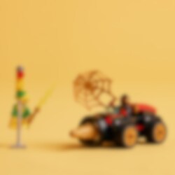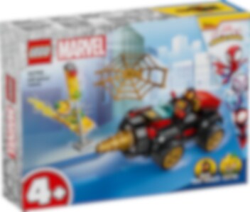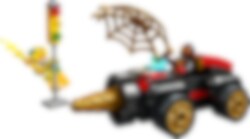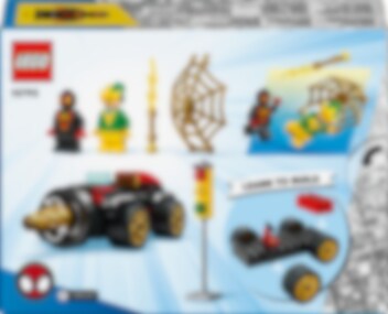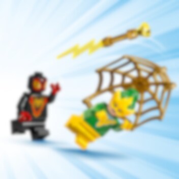 Electro bruker strømstøt for å sette et trafikklys ut av spill og stjele strømmen! Spin kjører i full fart til åstedet i sin tøffe LEGO® 4+ Borespinner-maskin. Det roterende boret foran feier all motstand av veien! Når Spin kaster et gigantisk gullspindelvevnett over den høyspente skurken, er det Electros tur til å få støt!