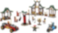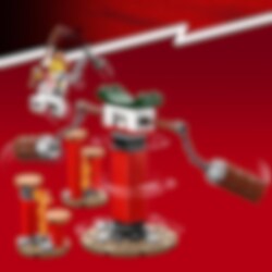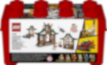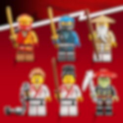 Finpuss ferdighetene dine i ninja-dojoen sammen med Nya, Kai og Mester Wu. Øv opp styrke og smidighet i treningsområdets hinderløype, men vær på vakt: Knokkeljegeren planlegger å bryte seg inn! Vær klar til å konfrontere ham i ninja-bilen eller på motorsykkelen. Du kan også bruke de 530 klossene til å bygge nye ninja-modeller og byggeforslag basert på instruksjonene.