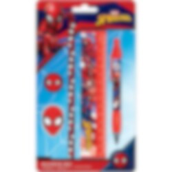 Kult skolesett med tøffe Spider-Man-motiver. Pakken inneholder en blyant, en kulepenn, en linjal, en blyantspisser og et viskelær.