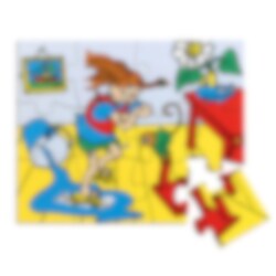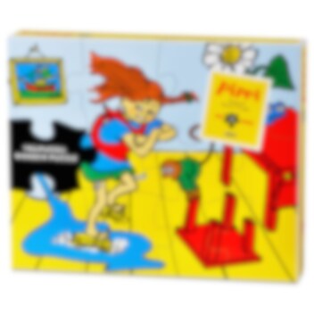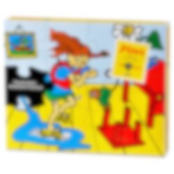Et morsomt Pippi-puslespill med et bilde av den morsomme Pippi Langstrømpe som skrubber gulvet på sin egen måte. Dette puslespillet i tre har i alt 12 brikker, og kan settes sammen i sin egen boks. Enkel å frakte med seg rundt. Illustrasjonen er laget av Ingrid Vang Nyman. Mål 22x18 cm.