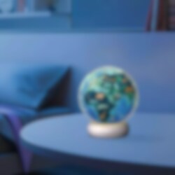 Den ferdige jordkloden blir 13 cm høy og består av 72 briker som danner en stabil form. En pedagogisk detalj som byr på både skaperglede og et trygt LED-lys i rommet.