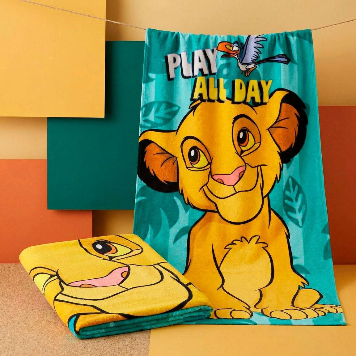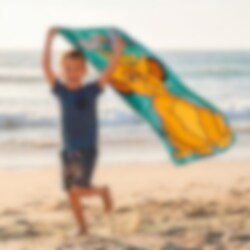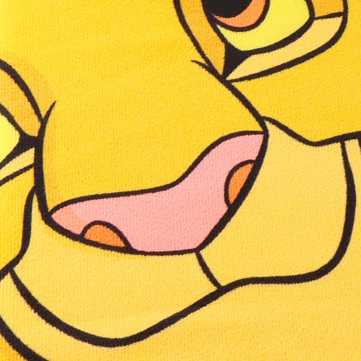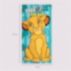 La eventyrene fra Løvenes Konge bli med til stranden med dette fargerike badehåndkleet. Motivet viser en glad Simba klar for lek og moro, mens vennen Zazu flyr ovenfor mot en turkis bakgrunn med jungelblader.