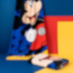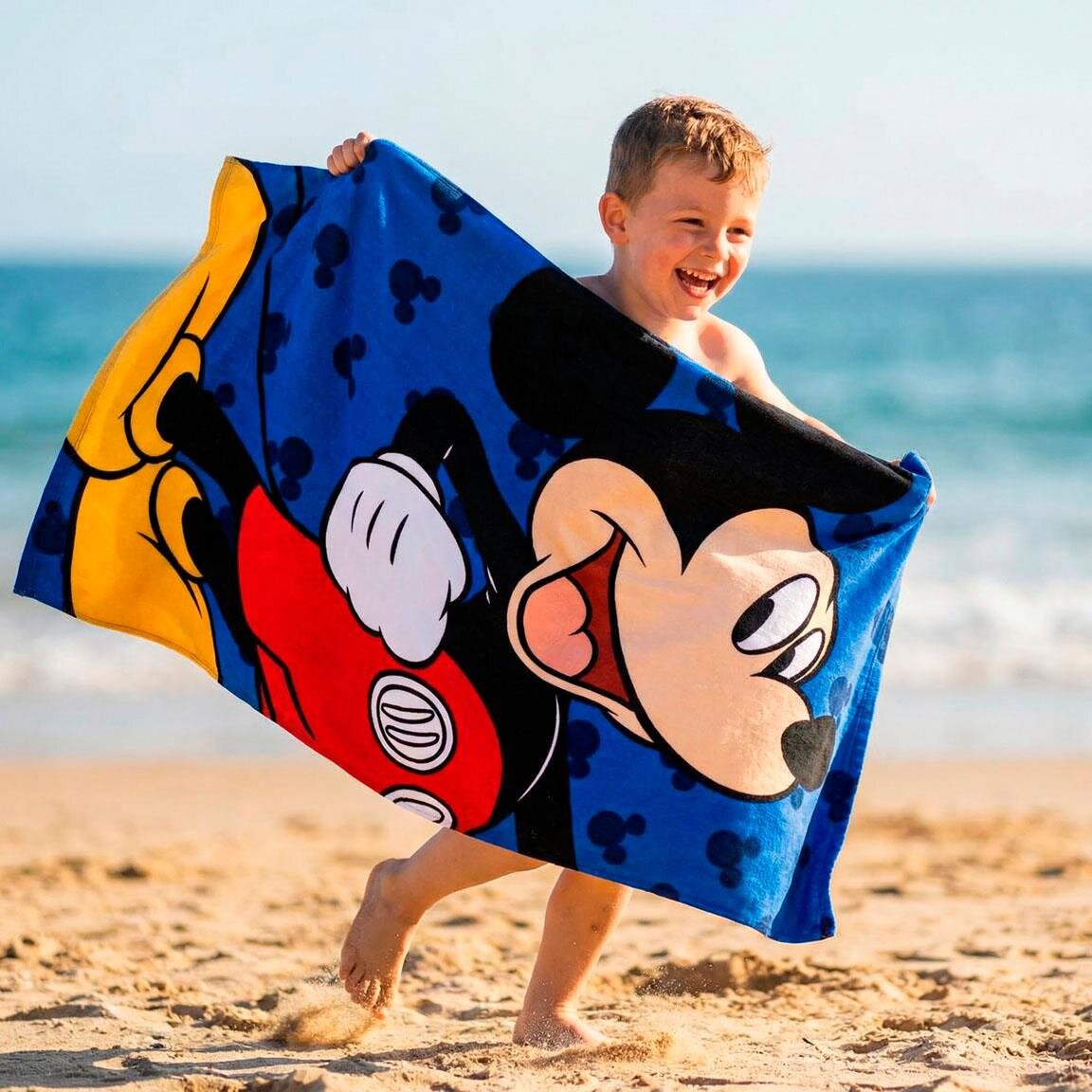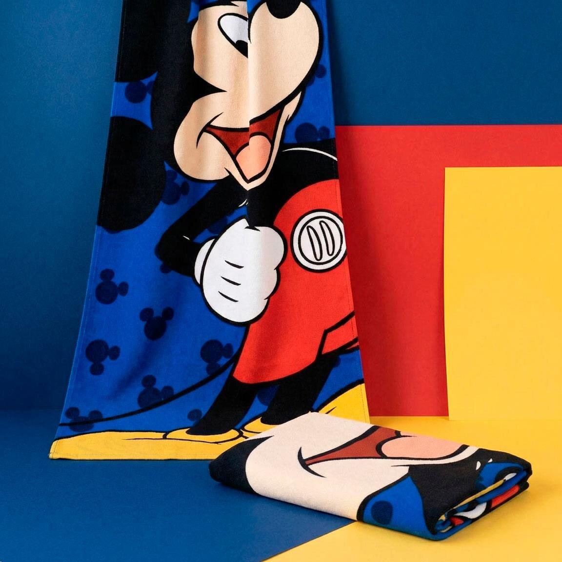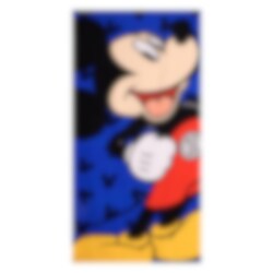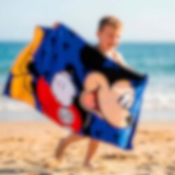 Gjør badestunden enda morsommere med et badehåndkle prydet av alles favoritt, Mikke Mus. Med sitt brede smil og de klassiske røde buksene sprer han umiddelbart glede på stranden eller ved bassenget. Den blå bakgrunnen med små silhuetter gir håndkleet en ekstra leken følelse som barna vil elske.