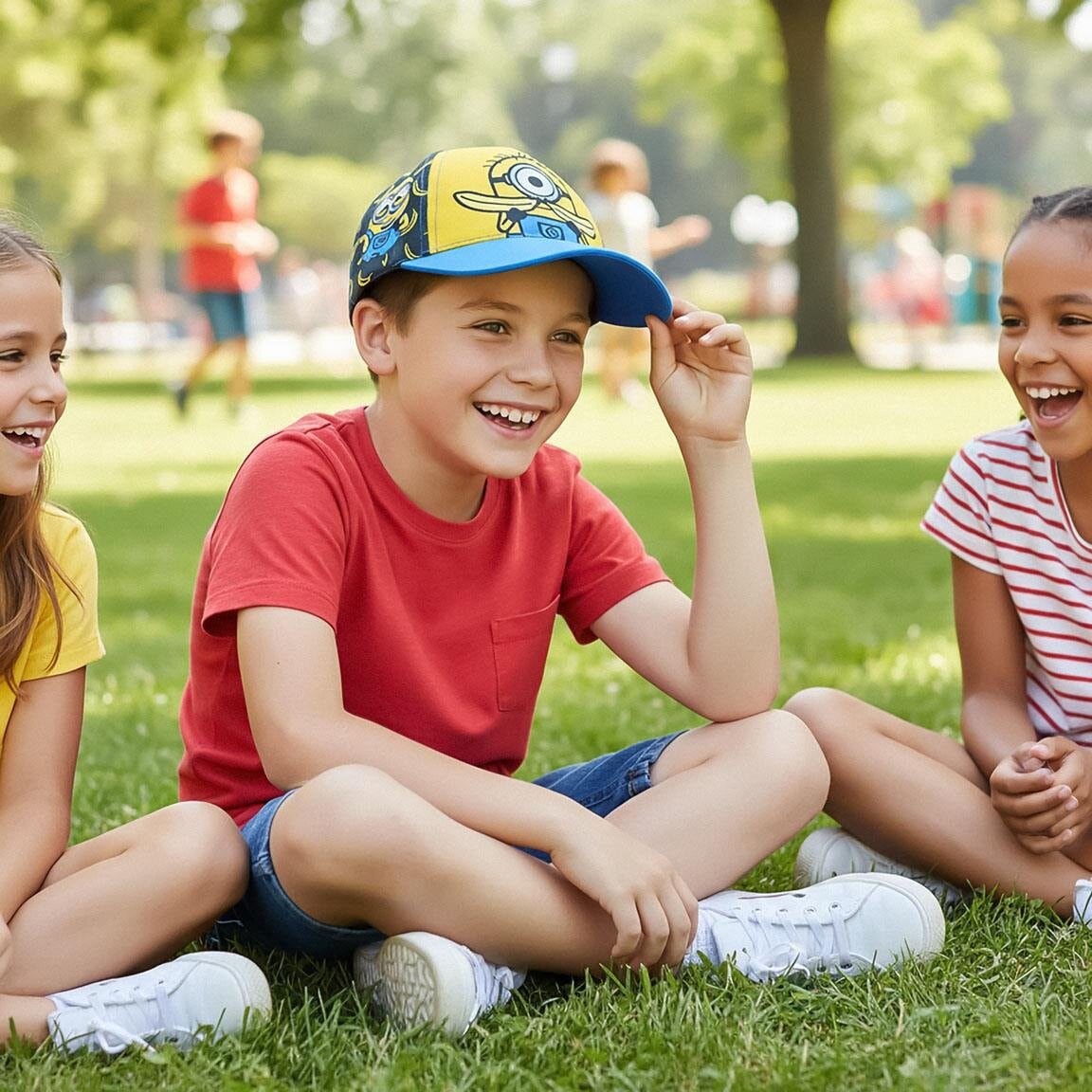 En fargerik barnecaps med Minions-tema, lekent design og morsomme motiver som gjør den til en favoritt blant barn. Ideell for solrike dager, lek og utflukter.