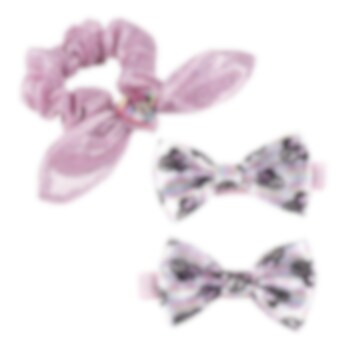 Gjør frisyren ekstra festlig med dette glitrende 3-pakningssettet med hårtilbehør med Minnie Mus! Settet inneholder to fine hårspenner med regnbueskinnende sløyfer og Minnie-motiv, samt en rosa glitter-scrunchie med sjarmerende kaninører.