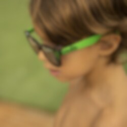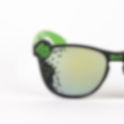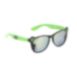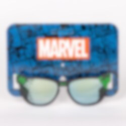 Premium solbriller for barn i grønt og svart med tøffe detaljer fra Hulken. På buene rundt de tonede glassene er superhelten Hulken og hans kraftige knyttneve å finne.