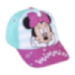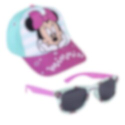 Et komplett sett med både en supersøt rosa og turkisfarget caps med Minni Mus på og et par premium solbriller, begge i barnestørrelser. De fargerike brillene har motiver av Minni Mus.