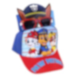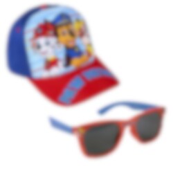 Et komplett sett med både en tøff blå og rød caps og et par premium solbriller, begge i barnestørrelser. På brillene er det motiver av de populære redningshundene, Marshall, Chase og Rubble.