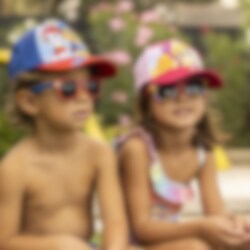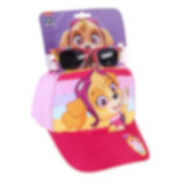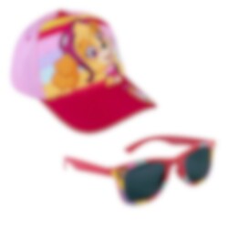 Et komplett sett med både en søt rosa- og rødfarged caps og et par premium solbriller, begge i barnestørrelser. På brillene er det motiver av den søte valpen Skye fra Paw Patrol.