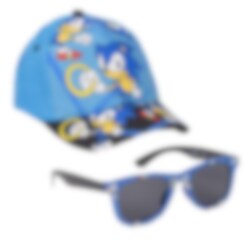 Et komplett sett med både en stilig blåfarget caps og et par premium solbriller, begge i barnestørrelse. På brillene er det motiver fra Sonic The Hedgehog-serien.