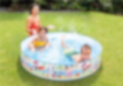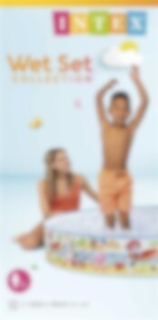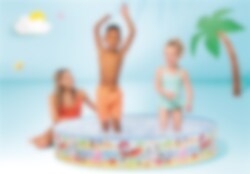 Intex barnebasseng med morsomt strandmotiv blir en morsom badeopplevelse som du kan ha i hagen. Bassenget har en størrelse på 152 x 25 cm og rommer 443 liter. Fra 3 år med tilsyn av voksne.