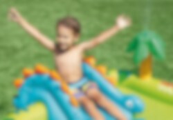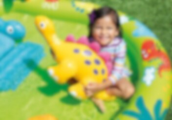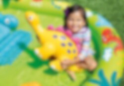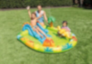 Lekebasseng fra Intex med morsomt dinosaurmotiv vil være den ultimate vannleken om sommeren. Her kan du og vennene dine suse nedover sklien mens den vannsprutende palmen er på for en morsommere opplevelse. Den innebygde vannsprøyten kobles enkelt til vannslangen. Passer for barn fra 2 år og oppover med tilsyn av voksne.