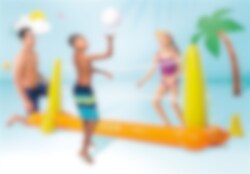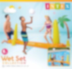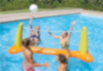 Intex volleyballsettet for poolen gjør badingen i bassenget til en morsom aktivitet. Pakken inkluderer nett, oppblåsbart stativ, ball og ankerposer med vekt.