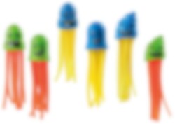 Kast blekksprutene i bassenget og se hvor fort du kan fange dem. Blekksprutene gjør det enda morsommere når du skal trene på å bli bedre til å svømme og dykke. De er veldig fargerike og er også gode som badeleker i badekaret for de minste barna. Lengde 12 cm.