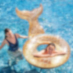 Virkelig eksklusiv og luksuriøs havfrue-badering i gull med masse glitter. Du vil bli den kuleste på stranden eller ved bassenget med denne baderingen. Den oppblåsbare glitterhavfruen er 147 x 107 x 79 cm.