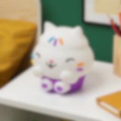 La den søte Cakey Cat lyse opp rommet med et mykt og behagelig skinn. Lampen er laget av myk silikon og viser Cakey Cat i sin klassiske positur. Den har tre lysmoduser som enkelt endres ved å trykke på hodet, og en innebygd timer som slår av lampen automatisk etter en stund. Perfekt til lesestund, leggetid eller som en sjarmerende innredningsdetalj for alle som elsker Gabby's Dollhouse.