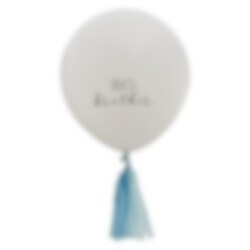 Fin stor hvit ballong med teksten ''Big Brother'' og med blå dusker. Ballongen blir 45 cm i diameter når den blåses opp og du får 2 stk. blå dusker.