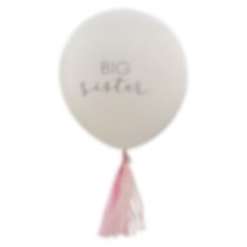 Stor hvit ballong med teksten ''Big Sister'' og som har fine rosa dusker. Ballongen blir 45 cm i diameter når den blåses opp og du får 2 stk. rosa dusker.