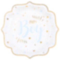 10 stk. fine tallerkener med teksten Baby Boy på og med fine detaljer i fargene lyseblå og gull. Kantene er også gullfolierte. Fine å dekke på med når det kommer til Babyshower eller til dåpen, i tillegg til at de er vakre å pynte med sammen med tilhørende krus, servietter og bordløpere i samme tema.