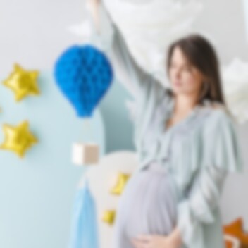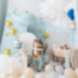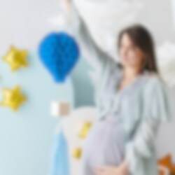 Honeycomb dekorasjon som forestiller en luftballong i blå farger. Dekorasjonen er laget av papir og er 90 cm høy.