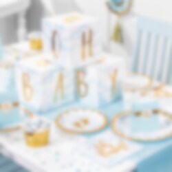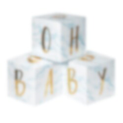 Disse 'Oh Baby' borddekorasjonene i blått er det perfekte tillegget til enhver babyshower. Hver emballasje inneholder tre kuber som du enkelt bretter sammen og setter på bordet. Kubene er vakkert marmorert i blått med bokstaver som danner ordene 'Oh Baby' og små babyføtter i gullfolie.