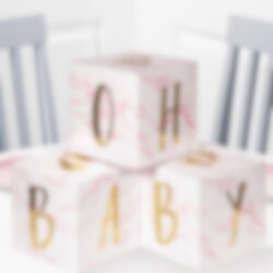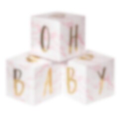 Disse 'Oh Baby' borddekorasjonene i rosa er det perfekte tillegget til enhver babyshower. Hver emballasje inneholder tre kuber som du enkelt bretter sammen og setter på bordet. Kubene er vakkert marmorert i rosa med bokstaver som danner ordene 'Oh Baby' og små babyføtter i gullfolie.