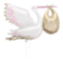 En kjempefin folieballong som forestiller en hvit stork med gull- og rosafolierte detaljer som kommer med en gullfoliert eske med påskriften "It's a girl" i hvitt. Den ultimate dekorasjonen å ta med til enhver baby shower-fest. Ballongen er ca 157 cm i størrelse og blåses opp med vanlig luft (ved hjelp av en ballongpumpe) eller med helium for å få den til å sveve i luften.