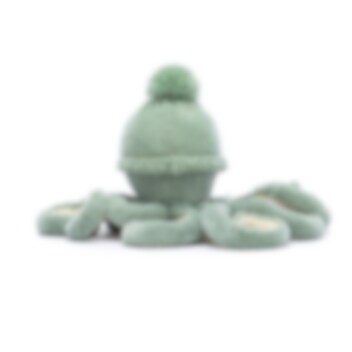 Den koseblekkspruten Odyssey har fått en fin strikkelue med et stort garnnøste. Det kan bli kaldt i sjøen også så Odyssey er glad for sin koselige og varme lue i nesten samme nyanse av mintgrønn som den myke pelsen. Med sitt glade smil, og åtte herlig krøllede armer med kremfløyelseksjoner, er dette den perfekte jubelkompisen for sjenerte, rastløse eller bare trøtte (og alle andre som liker å kose og noen ganger vil ha noe å oppta fingrene). Laget av polyester og håndvaskes om nødvendig.