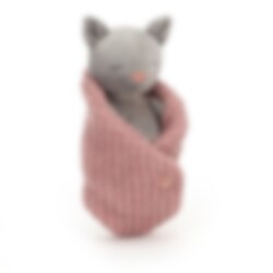 Denne lille koselige drømmende kattungen tar en lur pakket inn i et kosete gammelt rosa teppe holdt sammen med en knapp. Den søte lille lysegrå katten har søte små spisse ører, en liten rosa brodert nese, broderte lukkeøyne, søte små poter, og teppet kan åpnes når du vil kose pusen. Fredelig, vakker og nøytral - en beroligende venn for rastløse småbarn. Perfekt ved leggetid. Laget av 95% polyester, 3% rayon, 2% spandex og håndvask ved behov.