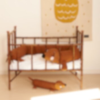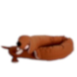 Sjarmerende dachshund med broderte detaljer i vakker rustbrun farge. Hunden kan brukes som en morsom og annerledes støtte i sengen til de minste, eller som en morsom pute og avslappende kosevenn for de eldre barna. Laget av økologisk bomull og trukket med polyester. (Oeko-Tex Standard 100). Vask i 30° skånsom vask og heng tørr. Størrelse: ca. 195 x 20 x 15 cm.