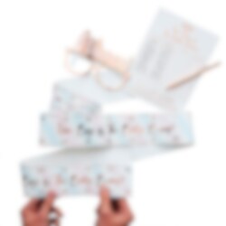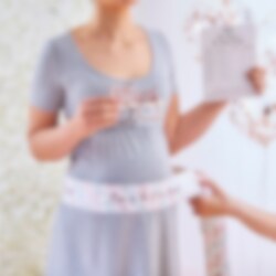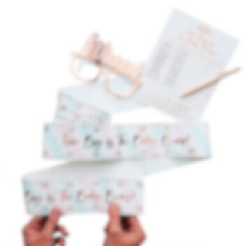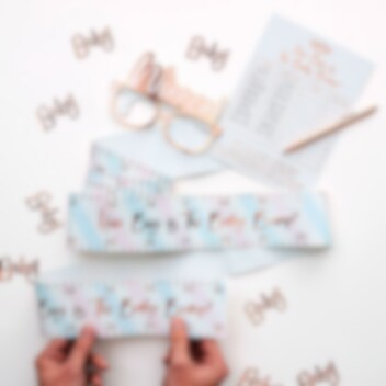 Att gissa måttet på mammans mage är en uppskattad lek och aktivitet på babyshower. Den här förpackning inkluderar ett måttband (200 cm x 7 cm), ett poängkort och ett par vinnarglasögon av papp.