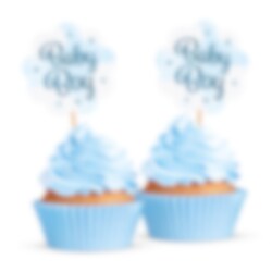 Gjør muffins og cupcakes ekstra festlige med disse dekorative muffinsdekorasjonene i lyseblått med teksten Baby Boy. De passer perfekt til baby shower, dåp eller velkomstfest og hjelper deg med å skape et søtt og enhetlig dessertbord.
