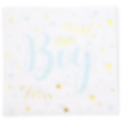 20 stk. servietter i hvit farge med søte detaljer i lyseblått og gullfolierte detaljer, i tillegg til at de har teksten Baby Boy på seg. Utrolig fine å dekke opp bordet med til dåpen eller om du skal overraske en nybakt mor med en Babyshower.