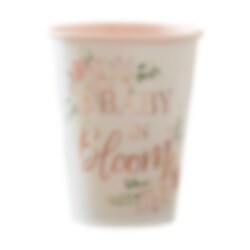 8 stk. papirkopper med dekorative blomster og påskriften "Baby in Bloom" i foliert rosegull. Koppene rommer rundt 260 ml. Koppene er ypperlige for både babyshower og Gender Reveal.