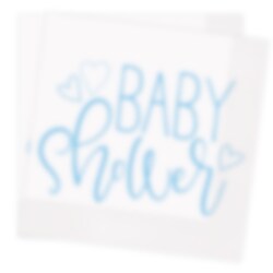 16 stk. hvite servietter med den blå teksten "Baby shower" på den ene siden. Serviettene er 2-lags og er ca. 33 x 33 cm store utfoldet.